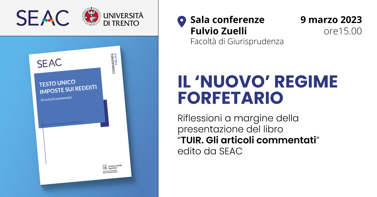 In occasione del convegno che si terrà il 9 marzo alle ore 15.00, presso la Sala Conferenze Fulvio Zuelli della Facoltà di Giurisprudenza di Trento, dedicato alle novità del regime forfetario, sarà presentato il nuovo volume “TUIR. Gli Articoli commentati“, edito da SEAC.